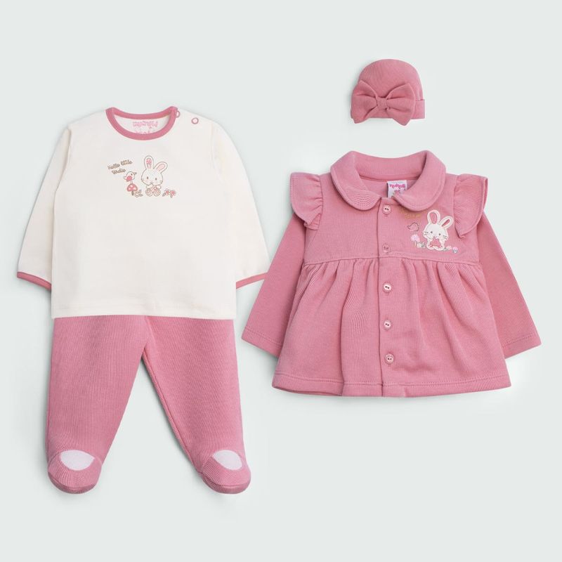 Ajuar alicia m l confeccionado en material punto ingles. Disponible en colores vibrantes como palo rosa, rosado, crema. Tallas disponibles: 0BB, 1BB, 2BB.