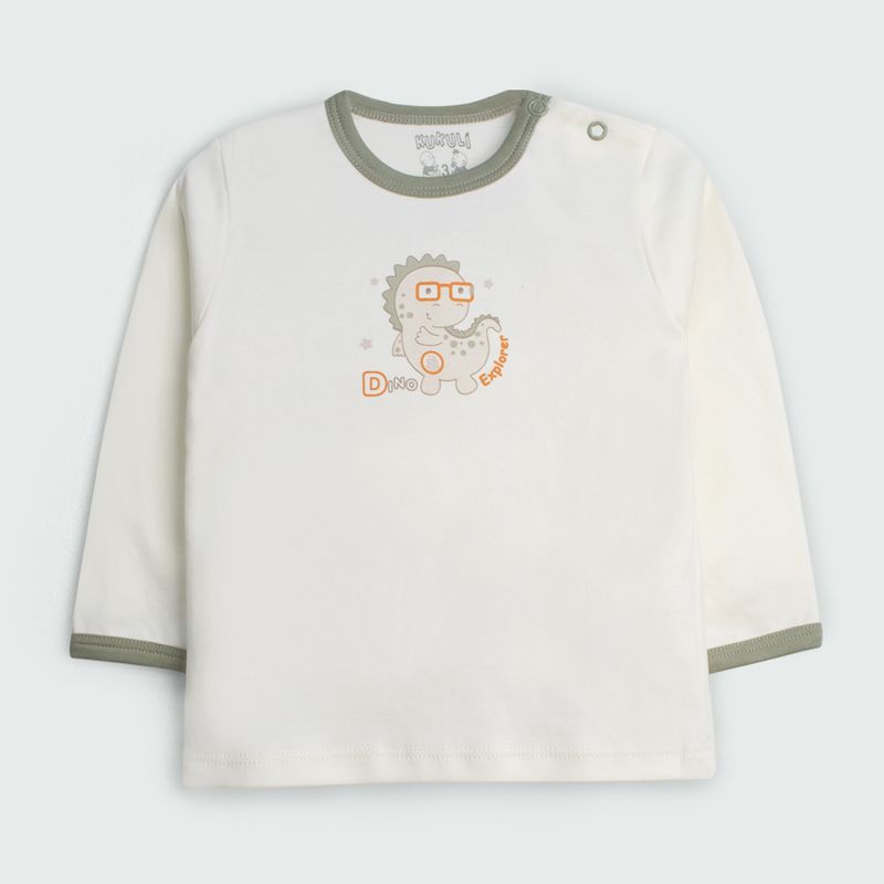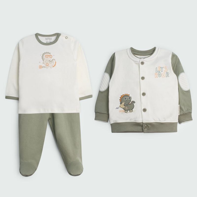 crema, melange y celeste, el ajuar combina funcionalidad y ternura en cada detalle. Sus acabados suaves, costuras delicadas y estampados divertidos con temática de dinosaurios hacen que cada conjunto no solo sea cómodo, sino también visualmente encantador.