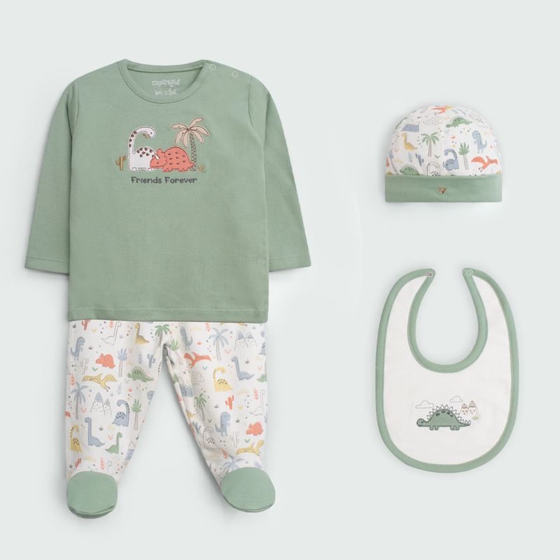 Ajuar dinos bebito confeccionado en material algodon pima. Disponible en colores vibrantes como verde, crema, ladrillo. Tallas disponibles: 0BB, 1BB, 2BB, 3BB. Compra online AJUAR DINOS BEBITO M1955 y mas AJUAR en nuestra tienda