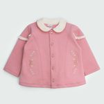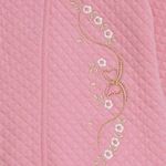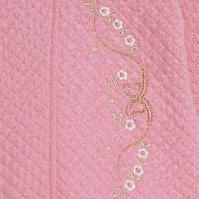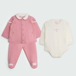palo rosa, violeta y hueso, este ajuar aporta un toque de ternura y elegancia a la ropita de la bebé. Es también una excelente opción como