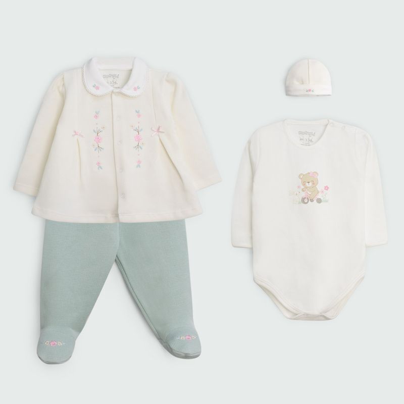 Este ajuar incluye piezas básicas y funcionales para el día a día, pensadas para facilitar el cambio de ropa y el cuidado del bebé. Su confección de alta calidad garantiza una excelente resistencia al uso y al lavado, conservando su textura suave y su forma original.