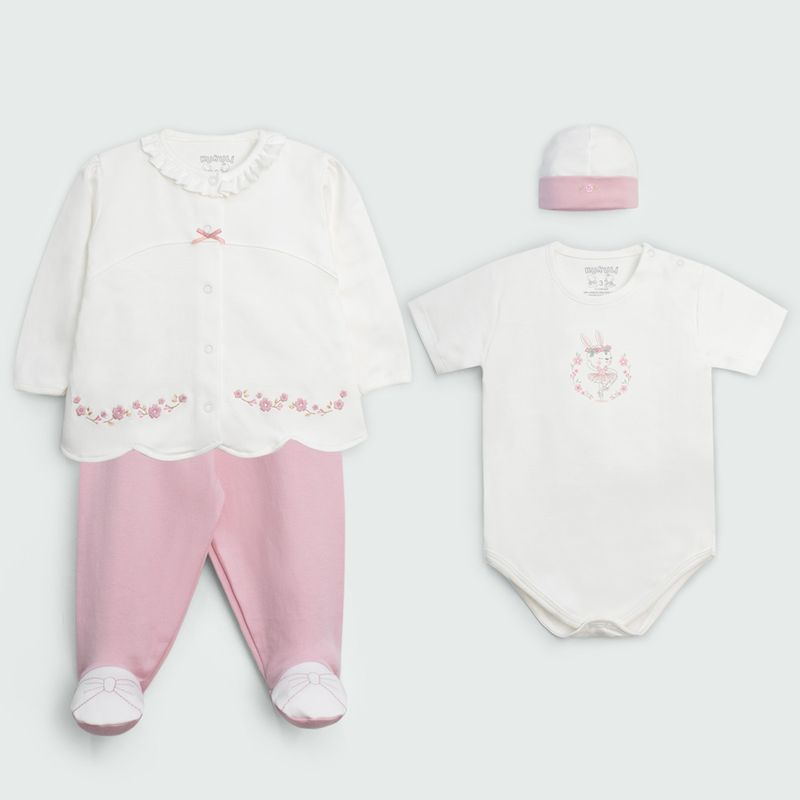 Ajuar onditas bebita confeccionado en material algodon pima de alta calidad, 4 piezas. Disponible en colores vibrantes como rosado claro, melange, crema. Tallas disponibles: 0BB, 1BB, 2BB, 3BB.