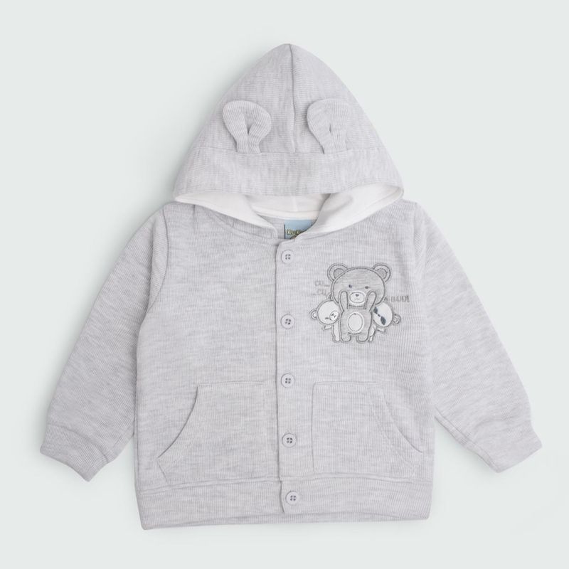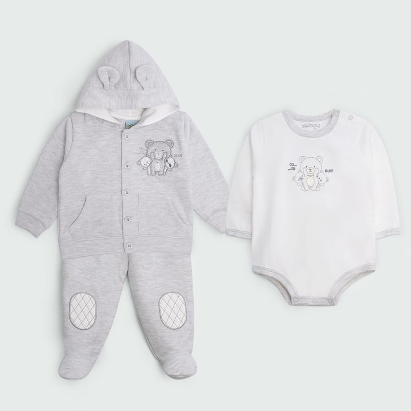 El diseño incluye un tierno bordado de osito que aporta un toque dulce y encantador, haciendo de este conjunto un regalo perfecto para baby showers, nacimientos o simplemente para darle la bienvenida al nuevo integrante de la familia con estilo y cariño. Está disponible en una paleta de colores vibrantes y modernos como melange, verde y beige, ideales tanto para bebés niña como niño.