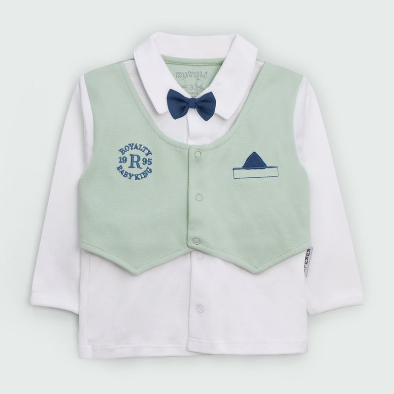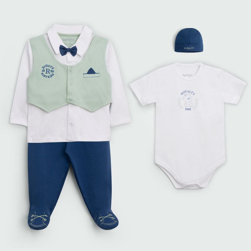 El ajuar Príncipe Bebé, elaborado en suave algodón Pima de alta calidad, incluye 4 piezas diseñadas para ofrecer confort y un estilo encantador a tu pequeño. Disponible en tonos frescos como verde, celeste y beige, este conjunto presenta un body de manga corta con cierre de broche, una camisa con una mini corbata y cierre de broche, y una chompa adornada con un bordado de letras y un barco, también con cierre de broche. El conjunto se completa con un pantalón cómodo y una gorra, creando un sofisticado y práctico para tu bebé. Con las Tallas: 0BB, 1BB, 2BB y 3BB.