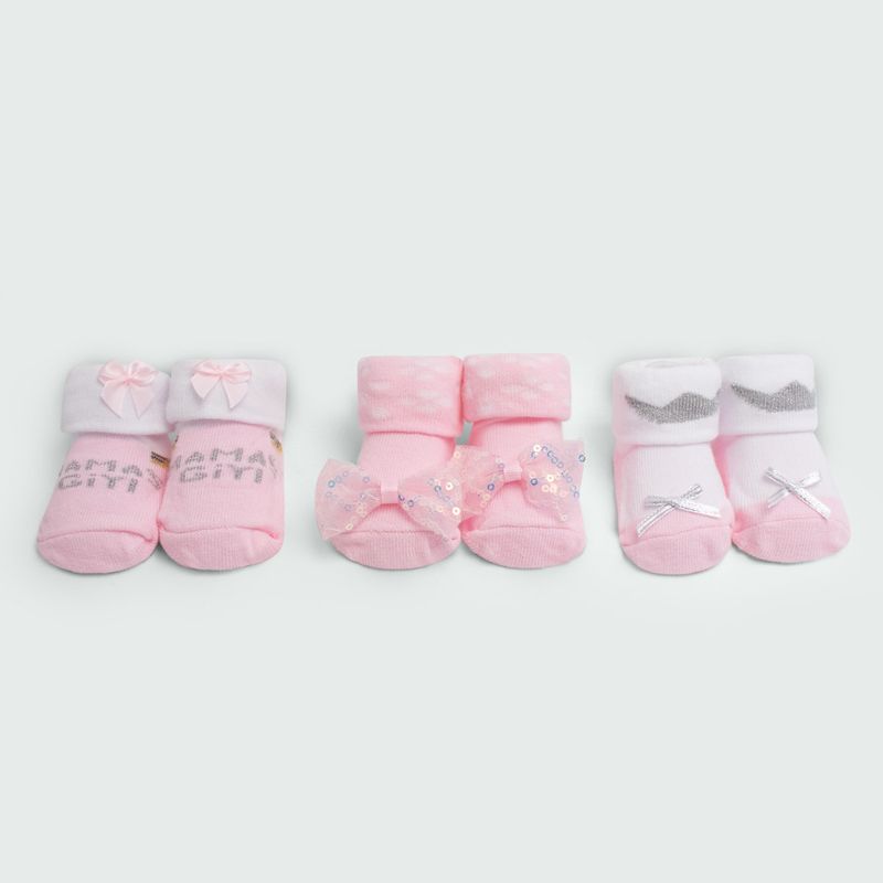 Cajita de medias x3 confeccionado en material algodon pima. Disponible en colores vibrantes como rosado oscuro, melange, azul. Talla: 0-9Meses.