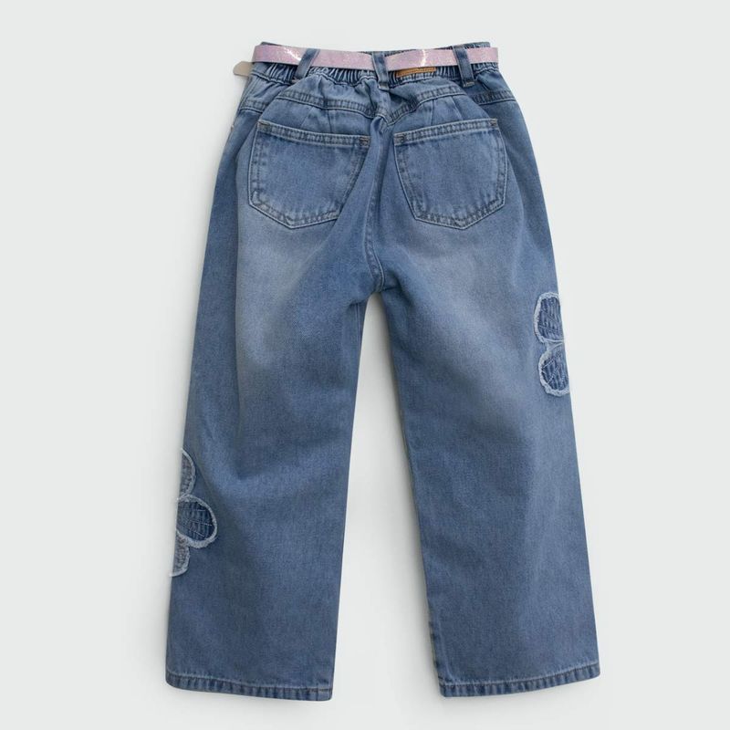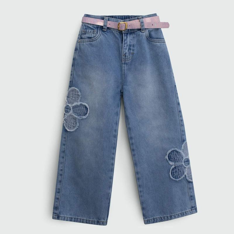 Pantalon recto flor nina confeccionado en material jean rigido. Disponible en colores vibrantes como celeste, azul. Tallas disponibles: 10T, 12T, 14T, 16T, 18T, 8T.