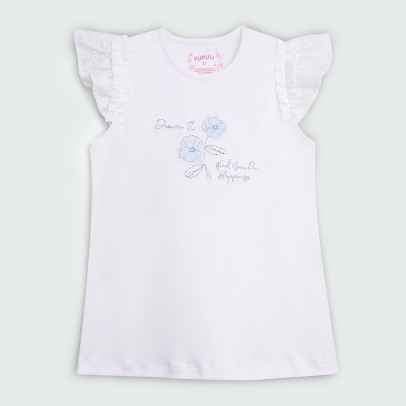 Polo Anely sin mangas para niña, confeccionado en algodón pima de alta calidad, suave y fresco, ideal para el uso diario. Presenta un diseño delicado en color verde menta, con detalles de volantes en los hombros y bordado floral en la parte frontal que le da un estilo tierno y femenino.
