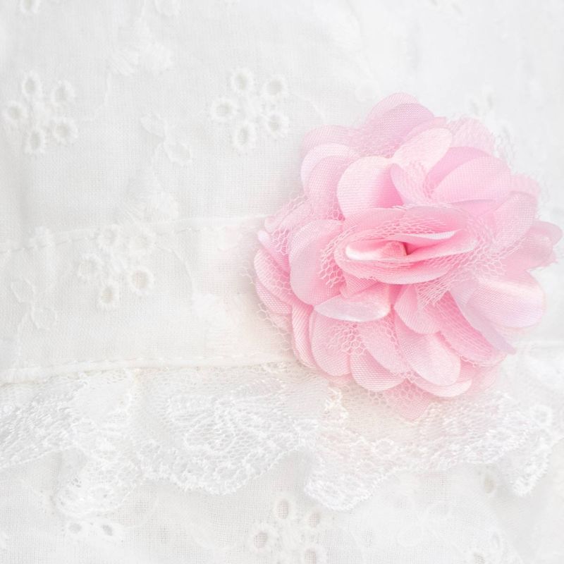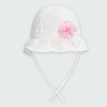 Sombrero aranza confeccionado en material popelina, Disponible en color blanco. Tallas disponibles: 6-12 MESES, 12-24 MESES.